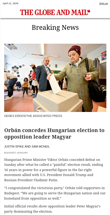Meanwhile, the fact that all major news organizations treat this result as top-tier breaking news is telling. After all, none other than J. D. Vance, the vice president of the United States, visited Hungary just a few days ago, effectively campaigning for Orban. Trump also expressed his support. I already saw breaking news e-mails from the Associated Press and The Globe and Mail. The result is also top-page breaking news on CNN’s Web site.