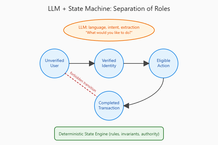 The important thing is, the language mode does not decide what the next state is. It has no direct authority over the state of the customer’s account. What it can do, the only thing it can do at this point, is initiating a valid state transition.